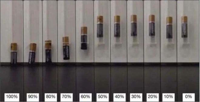 这种差异由电池内部的结构变化导致。碱性电池的锌阳极是含有锌粉的凝胶状物质,凝胶容易吸收冲击,因此新电池下落时不容易反弹。而随着电池放电,锌反应生成氧化锌,凝胶就变成了更坚硬的固体——这样一来,旧电池就更容易反弹了。